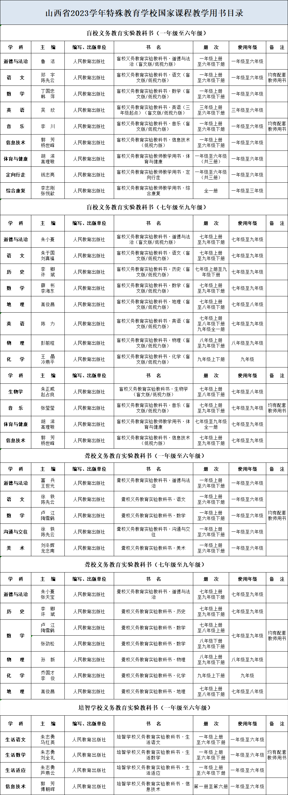 添加方式:| 山西省教育厅关于印发《山西省2023学年中小学教学用书目录》的通知 各市教育局: 根据《教育部办公厅关于2023年中小学教学用书目录的通知》(教材厅函〔2023〕2号)等文件精神,现将《山西省2023学年中小学教学用书目录》(以下简称《目录》)印发你们,并提出以下要求,请遵照执行。 一、义务教育国家课程教学用书 义务教育国家课程相关学科使用《山西省2023学年义务教育国家课程教学用书目录》中的教材。 二、普通高中国家课程教学用书 普通高中相关学科使用《山西省2023学年普通高中国家课程教学用书目录(根据2017年版课程标准修订)》中的教材。 三、特殊教育学校、体育运动学校类教学用书 (一)特殊教育学校义务教育阶段相关学科使用《山西省2023学年特殊教育学校国家课程教学用书目录》中的教材。没有新编教材的学科和年级仍使用原版本教材,或根据教学实际,选择普通学校教材中适合的内容进行教学。 (二)体育运动学校道德与法治、语文使用国家统编教材,其他学科使用《山西省2023学年体育运动学校国家课程教学用书目录》中的教材,或根据教学实际,选择《山西省2023学年义务教育国家课程教学用书目录》中的教材。 四、其他教学用书 教育部组织编写的中小学民族团结进步教育教材《中华民族大团结(供初中使用)》(戢广南主编,人民出版社出版)已于2021年经国家教材委员会审核通过。各地根据《教育部等四部门关于印发〈深化新时代学校民族团结进步教育指导纲要〉的通知》要求做好教材选用使用工作。 五、工作要求 (一)本《目录》是山西省行政区域内中小学校2023学年(上下两学期,即2023年秋季和2024年春季)学生使用教材、各级教育部门管理教材工作的重要依据。各级教育行政部门要严格依据本《目录》,与出版发行部门积极合作,共同做好2023学年中小学教学用书的发行和管理工作。 (二)中小学教材选用使用按照《教育部关于印发〈中小学教材选用管理办法〉的通知》(教材〔2023〕1 号)执行。 (三)初中、普通高中日语、俄语教学用书按照教育部《2023年中小学教学用书目录》(教材厅函〔2023〕2号)选用。普通高中开设德语、法语、西班牙语教学按照《普通高中课程方案》(2017年版2020年修订)和相应科目课程标准(2017年版2020年修订)执行。 (四)教材配套的数字音像材料,应参照《中小学教辅材料管理办法》由学生根据需求自愿购买,不得随教材统一征订。鼓励教材出版单位采取互联网下载的方式免费提供。中小学教材中严禁夹带任何商业广告或教学辅助资料的链接网址、二维码等信息。免费教科书采购按照有关财务政策执行。 (五)各有关出版、发行部门要严格按照《目录》确定的教材品种、版本、选用范围和各县(市、区)教育行政部门统计上报的征订数量,严格按照中小学校教学计划和工作安排,切实做好中小学教材的供书工作,保证课前到书,人手一册。严禁在发行过程中增加内容、增删册次、搭售《目录》以外的任何资料,严禁随意扩大征订范围,严禁将教科书和配套光盘、磁带捆绑发行、销售。 (六)各级教育行政部门要严格落实教材监管责任,健全教材使用管理工作机制,不折不扣执行国家和我省教材管理的政策规定,加强对区域内中小学校教材征订、使用工作的管理、监督和检查,严禁任何单位和学校选用《目录》以外的其他教材。对未按规定擅自更换教材、使用《目录》以外教材的地方和学校严肃处理,责令纠正,并将有关情况及时上报。省教育厅将会同有关部门对各地教材使用情况进行检查,对教材征订、发行、使用过程中的违规行为严肃查处,保证全省中小学教学用书工作规范、平稳、有序进行。 各市教育行政部门要按照本通知要求,抓紧做好2023学年中小学教学用书工作,2023年8月31日前通过教材选用备案系统将本市教材选用使用情况报省教育厅备案。 有关教材目录信息可登录山西省教育厅网站(http://jyt.shanxi.gov.cn/)通知公告栏中查询下载。各市要在第一时间将本《目录》全文转发至所辖县(市、区)和中小学校。 附件:2023年山西省中小学教学用书目录 |